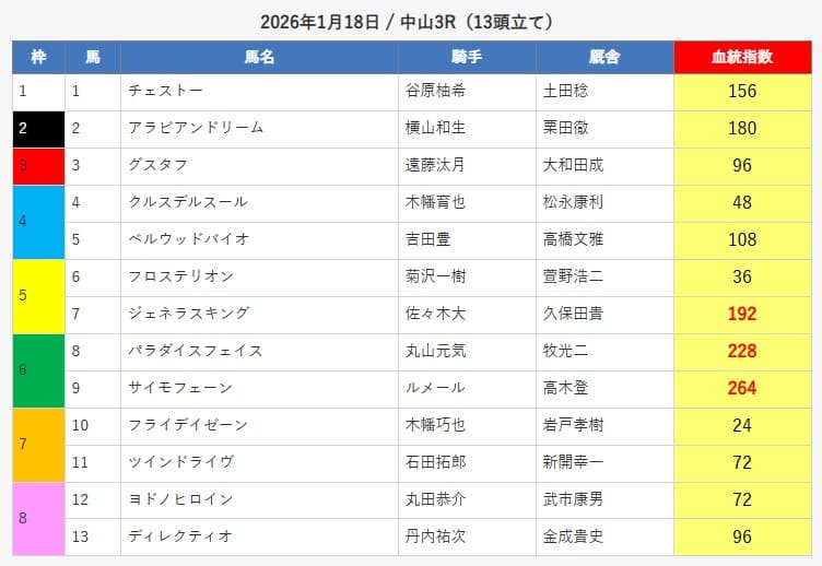 | ベストホース | 13戦5勝8敗 | 38% | 73% | 1.6/5 |
