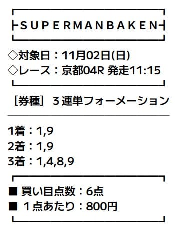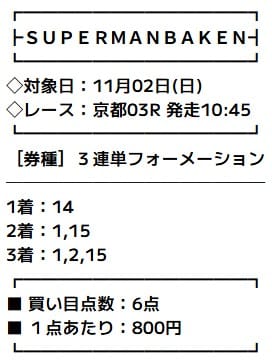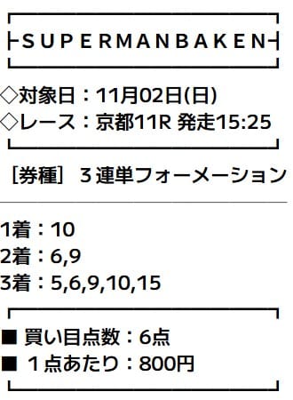 | 2025/11/02(日) | 京都11R | 1,386,800円 | 28891% |