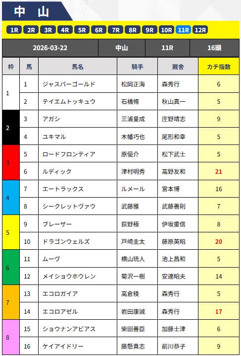 | 対象会場/レース名 | 中山1R | 中山1R | 中山11R | 中山11R | 中山11R |