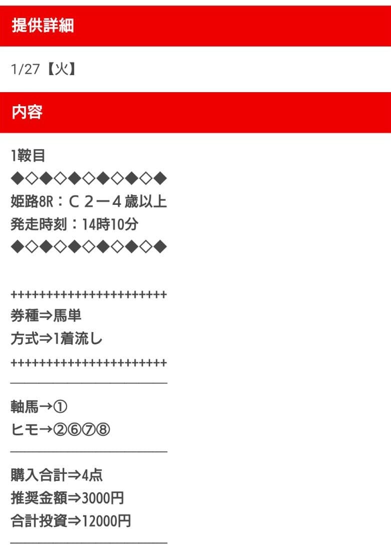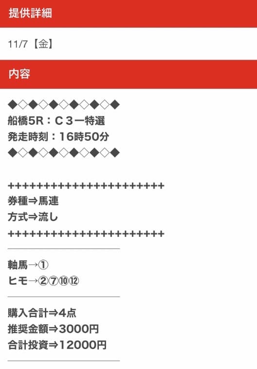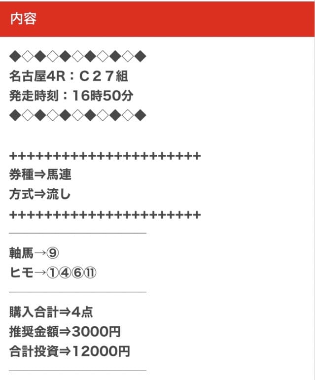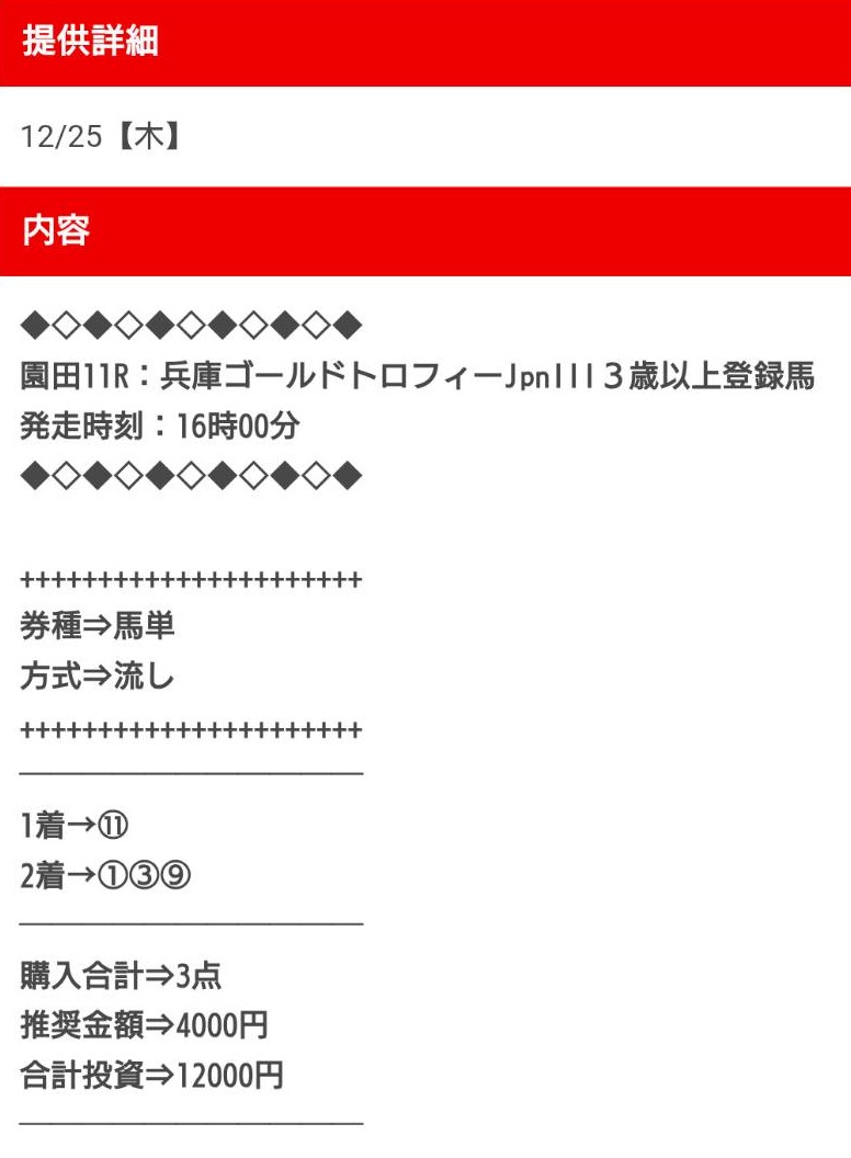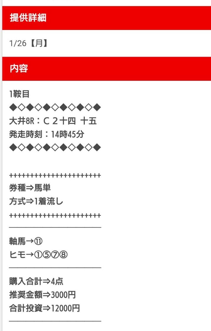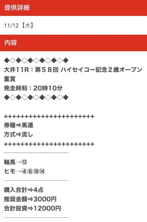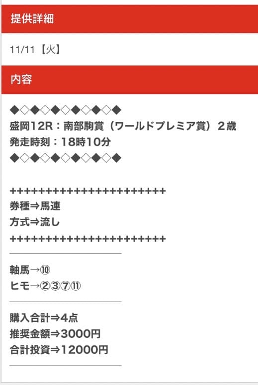 平均馬券代が12,000円と他の競馬予想サイトよりも高額なため、外れた時のリスクが非常に高いサイトです。