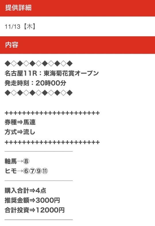- 11/13 名古屋11R 馬連 7,800円的中