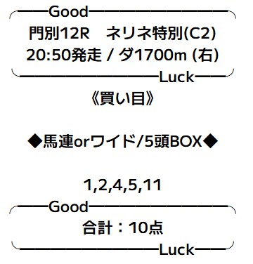 - 10/29 門別12R ワイド 840円的中