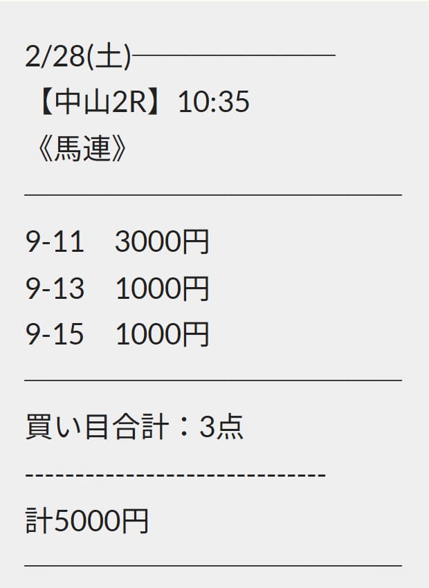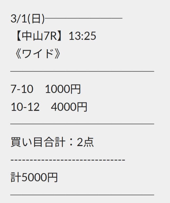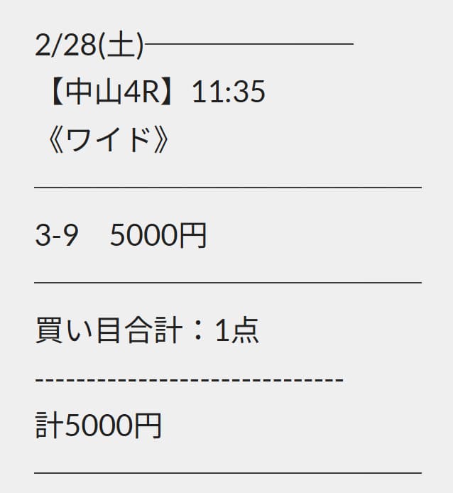 今回も公平な検証を行うために買い目通り計2点で購入。合計馬券代は5,000円です。