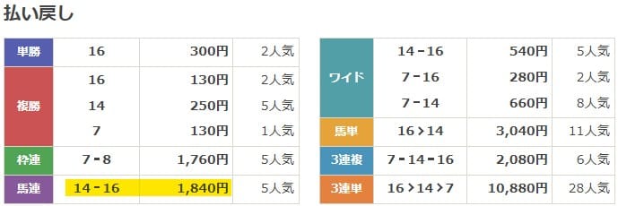 結果は16>14>7となり、馬連的中!