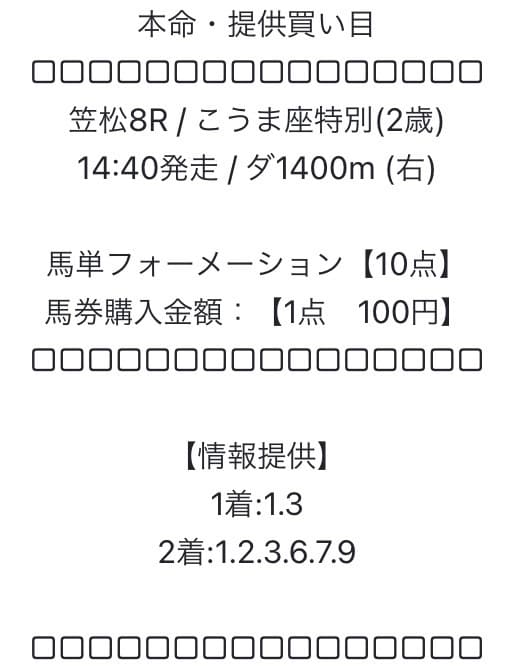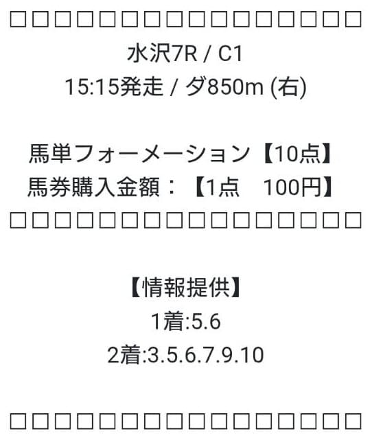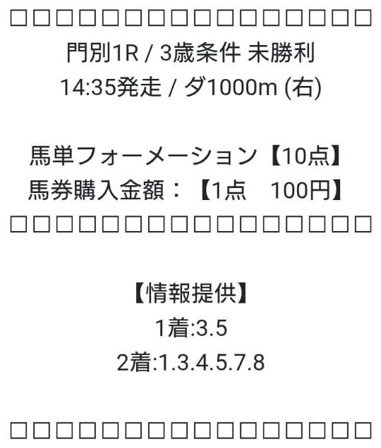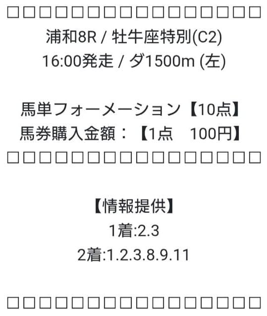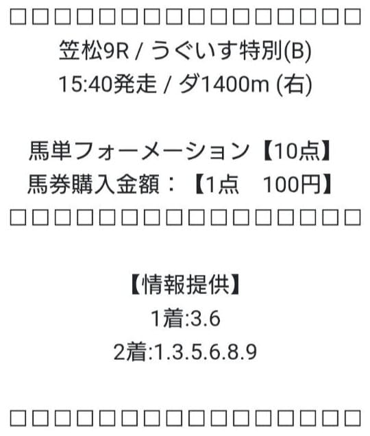 それがどれほど当たるのか、買い目の指示通り、馬単フォーメーションを1点100円ずつ購入し、合計1,000円分の馬券を買いました。