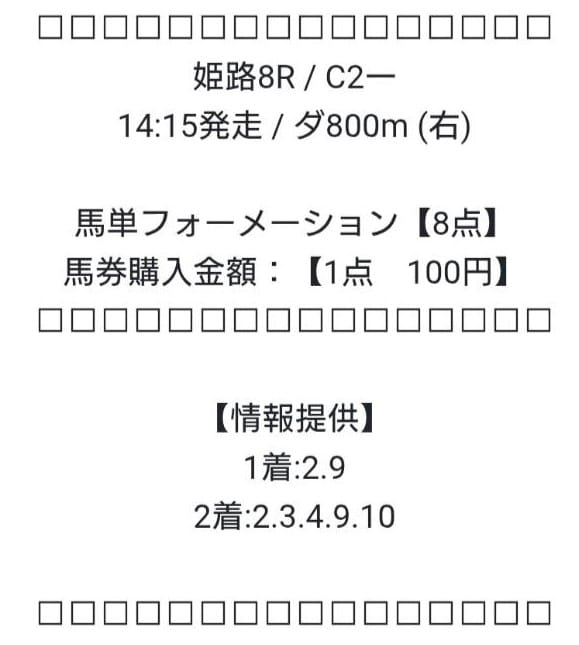 買い目を見ると、1番人気から12番人気のメイショウクメハチまで含められており、バランスの良い構成です。