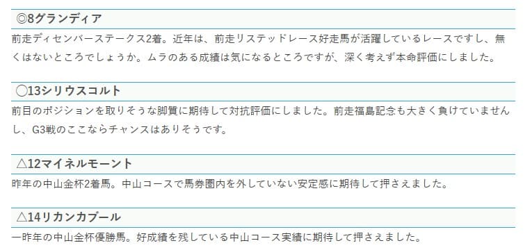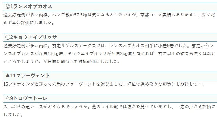 「深く考えない競馬」の無料予想は、印(◎〇▲△)+簡潔な見解で推奨4頭を公開するスタイル。指数や細かな買い目の指定はなく、印から馬券を各自で組み立てるのが基本です。