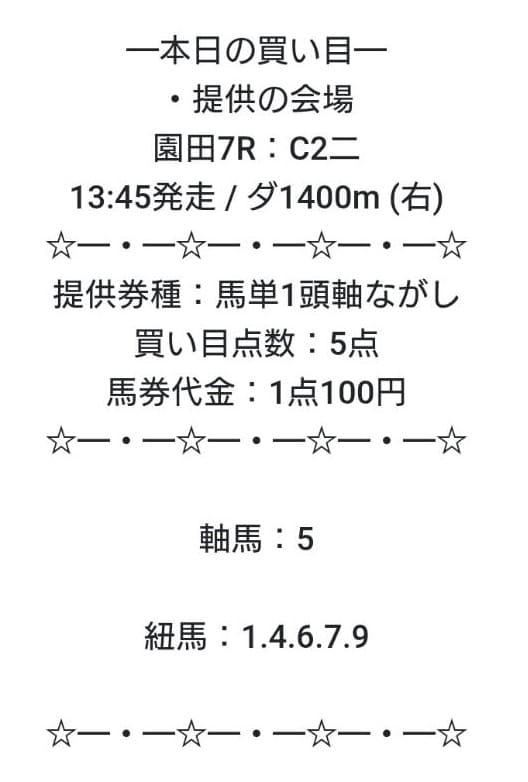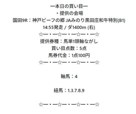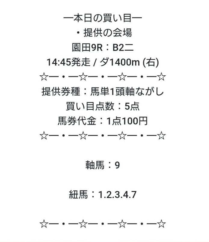 | 買い目公開 | その日に参加するレースを自分で選択し、事前に対象レースと買い目を案内 |