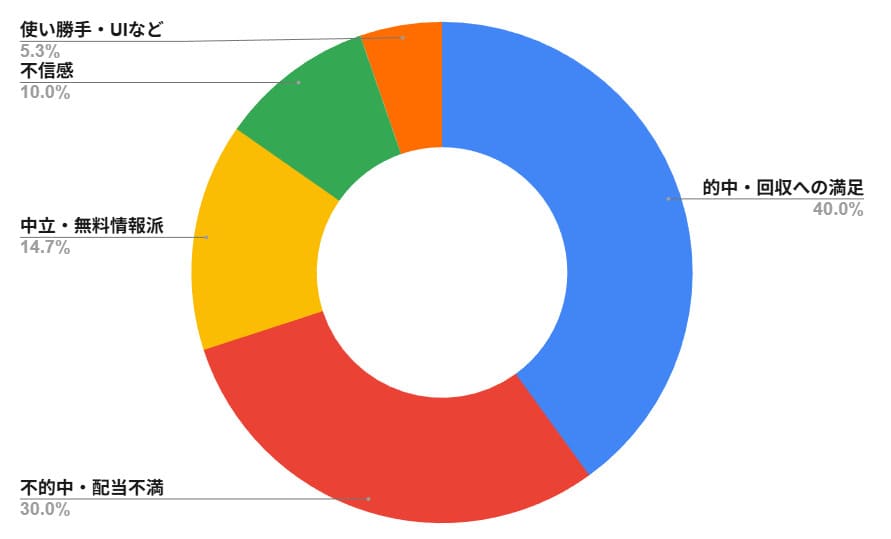 - 「配当」:的中はするものの、買い目が多いことや人気馬に寄ることで「利益が出ない」という回収率の低さに不満が集中している