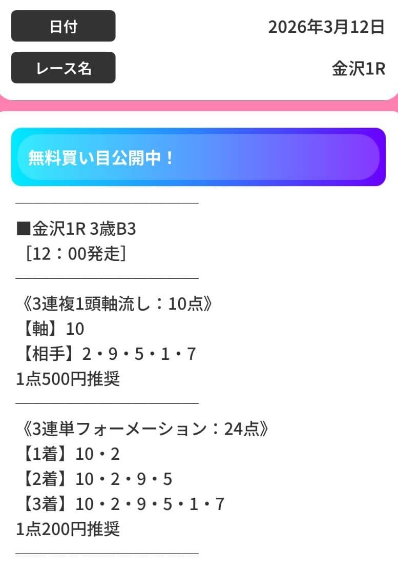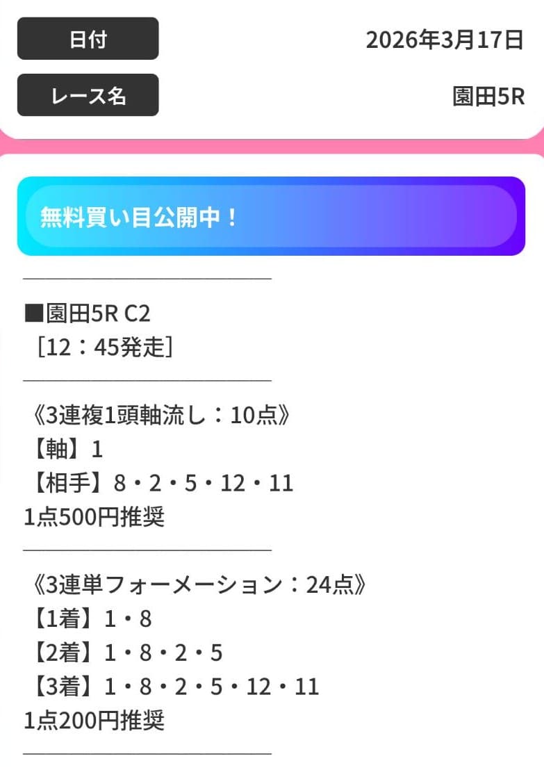 | メリット③ | 毎日無料予想が提供される |