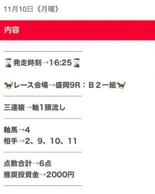 - 11/10 盛岡9R 三連複 ハズレ