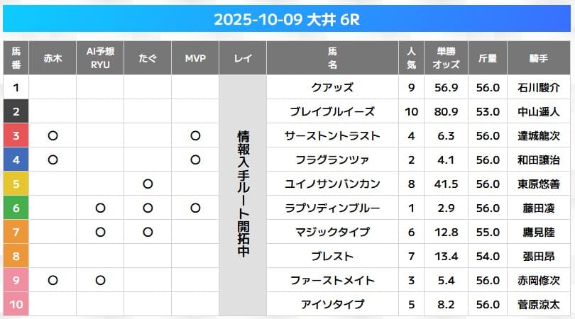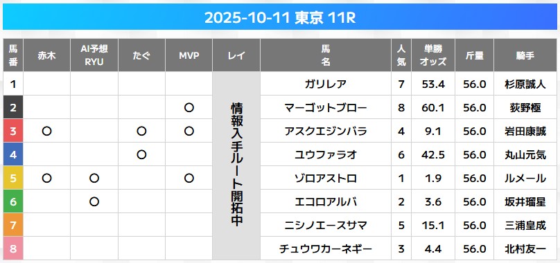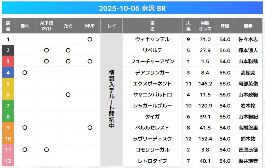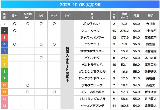 万馬券EXPOの無料予想は、各予想家が自信のある馬に「〇」を付けるシンプルさが特徴。