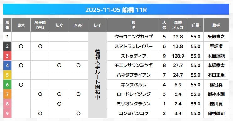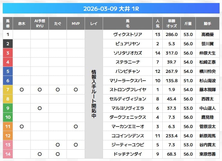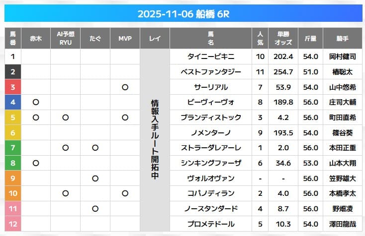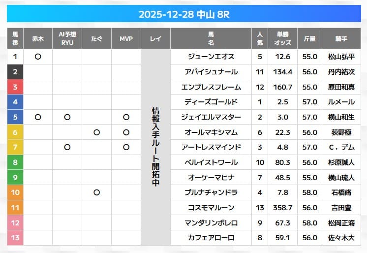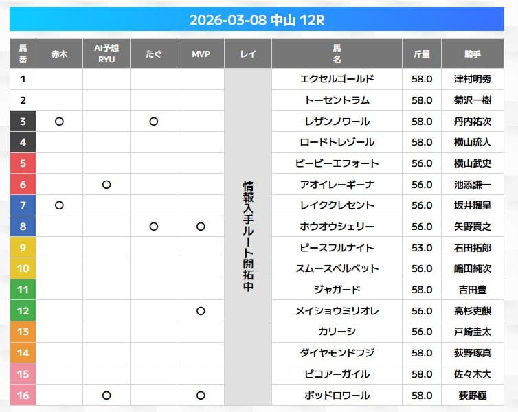 万馬券エキスポの無料予想は、複数の馬券師が自信ある馬に「〇」をつける形式。