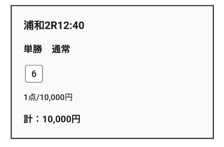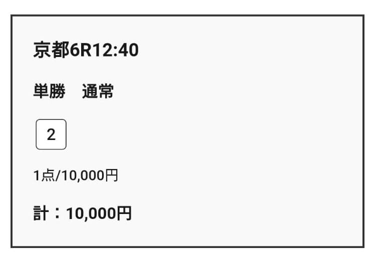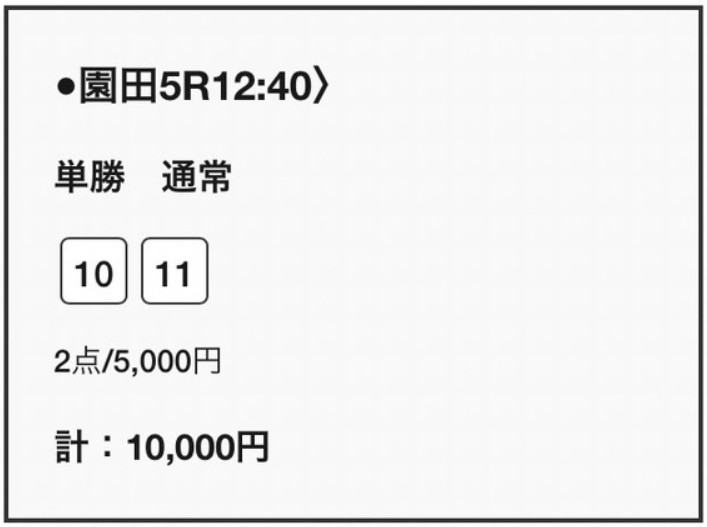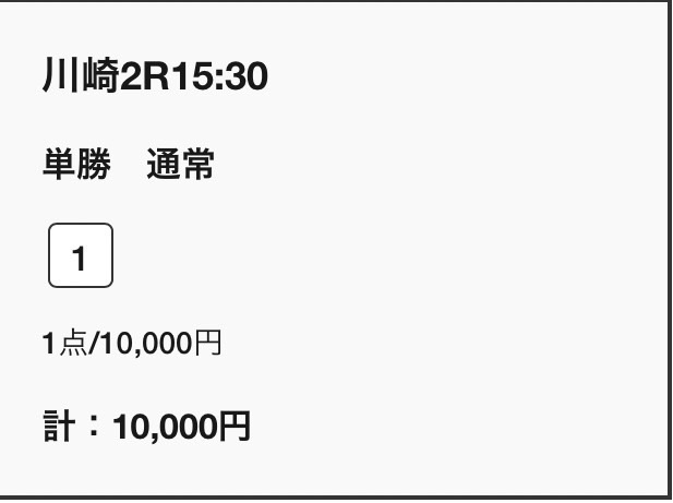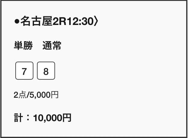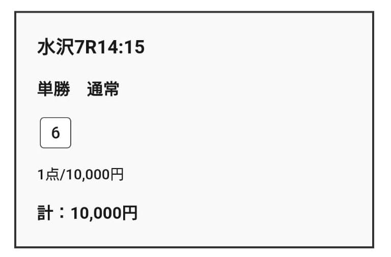 それでも検証のため、買い目の指示通り単勝2点×5,000円=合計10,000円を実際に購入しました。