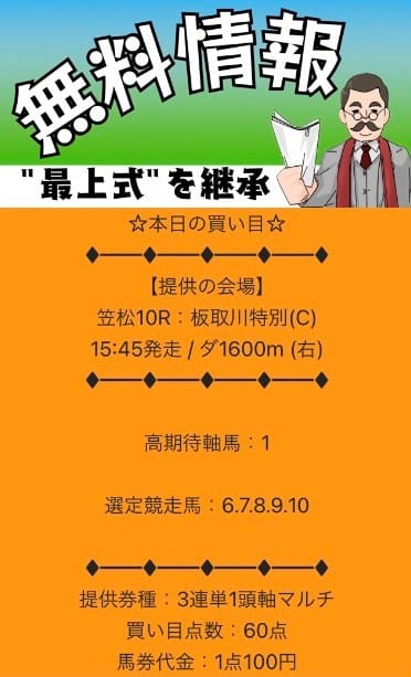 最上式勝馬投票券の無料予想は、独自の「期待指数×オッズ」で高回収率を実現とサイト内で謳っています。