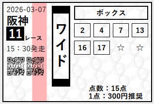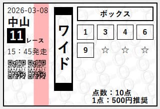 今回は提示された5頭を使い、ワイド5頭ボックス(10点)を1点500円=合計5,000円で実際に購入して検証しました。