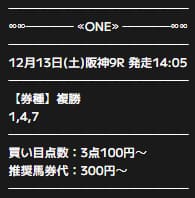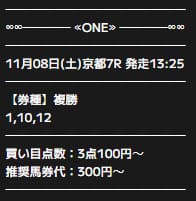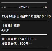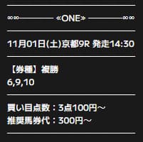 少々高額な予想ですが、無料予想での利益もありますし、なによりONEの予想なら信頼できると思い、思い切って購入してみました。