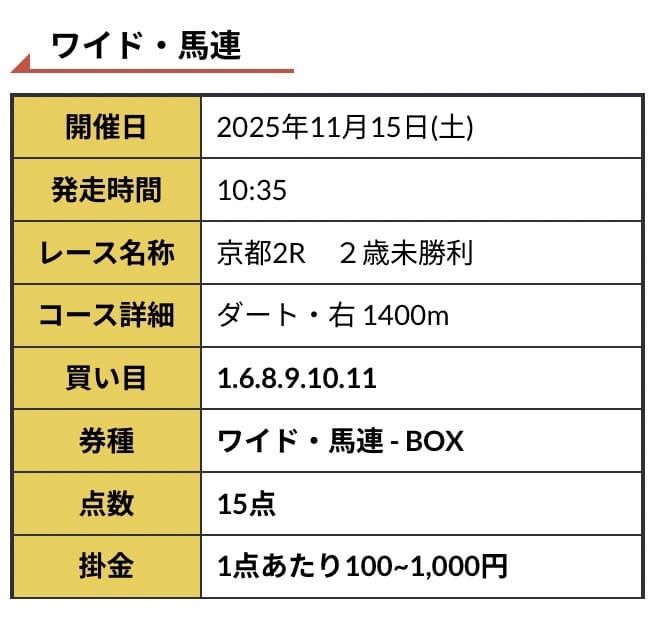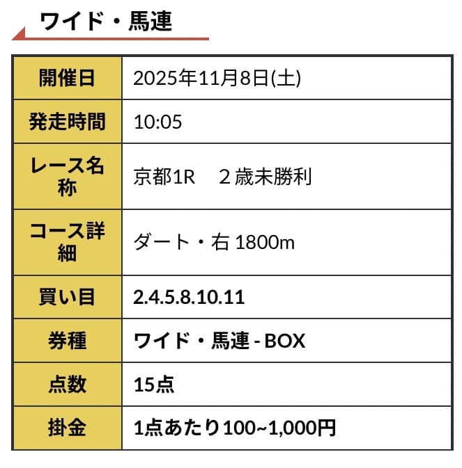 - 11/08 京都1R ワイド 1,000円的中