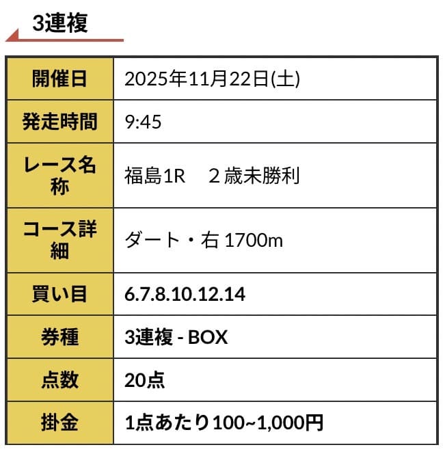 - 11/22 福島1R 三連複 22,290円的中