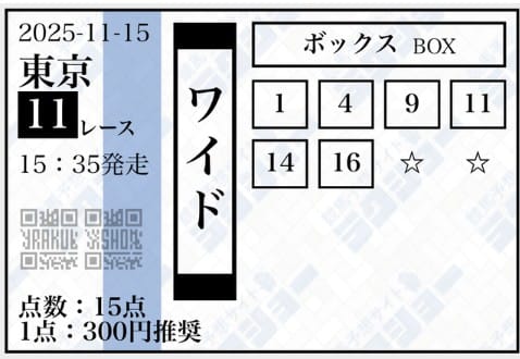 - 11/15 東京11R ワイド 2,250円的中