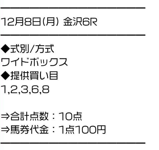 | 血統の暗号 | 64,800円 | 600,000円 | 三連単 | 5,000円以内 |