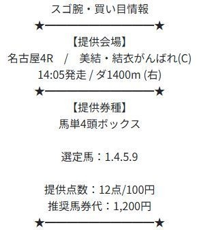 買い目は、人気上位の④ブラウオリゾン(1番人気)、⑨タノシサ(2番人気)、⑥ビギニングドリーム(3番人気)に加えて、一発の魅力がある中穴①ミサイルビスケッツ(6番人気)を絡めた4頭構成。