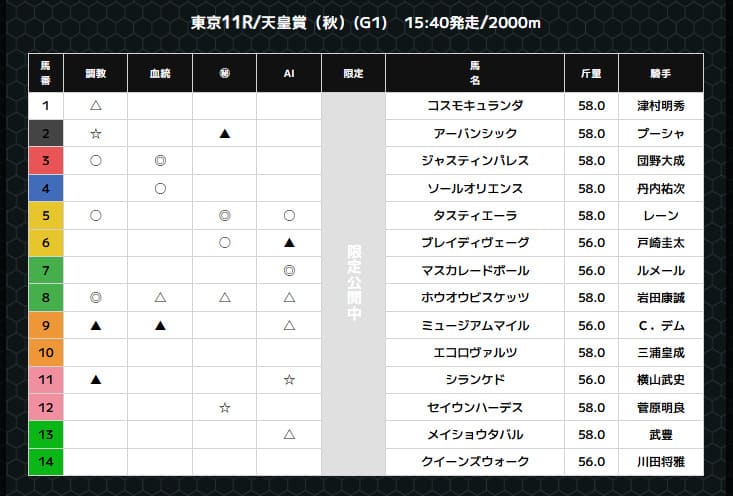 とくに「調教」「㊙」「血統」「AI」など複数の観点から印を出している点は、他サイトよりも分析の厚みを感じる部分。