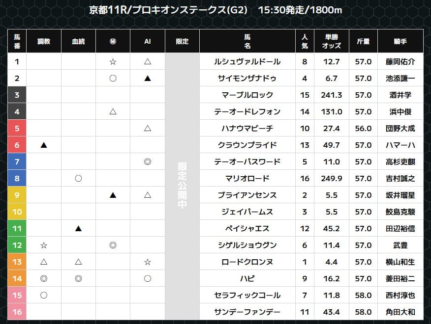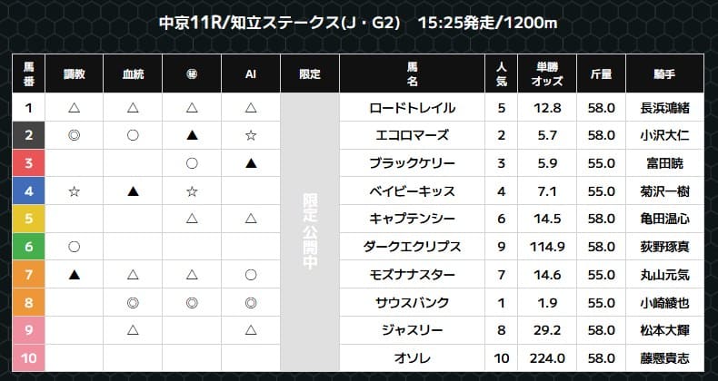 中央競馬の無料予想は◎〇△▲☆の印で「調教」「血統」「㊙」「AI」の4つの項目でそれぞれが印を公開するスタイル。