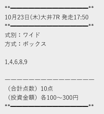 ワイド5頭ボックス(10点)を1点100円で購入し、1,000円分の馬券を購入しました。