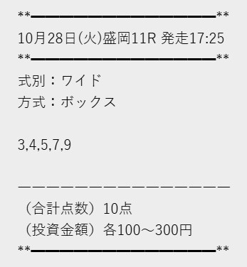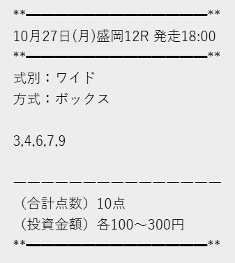 前日に続き、上位人気に寄せつつも中穴ゾーンまで網羅した5頭の買い目でした。