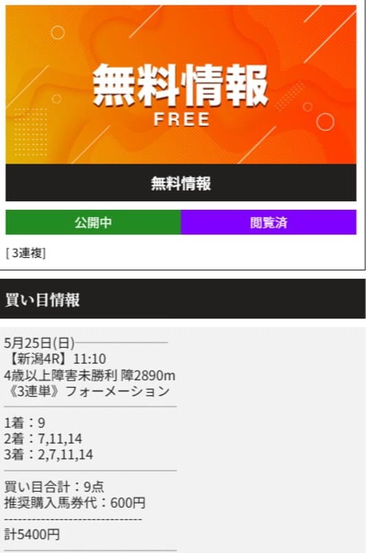 ※買い目の指示通り購入。直近5レースの無料予想を掲載