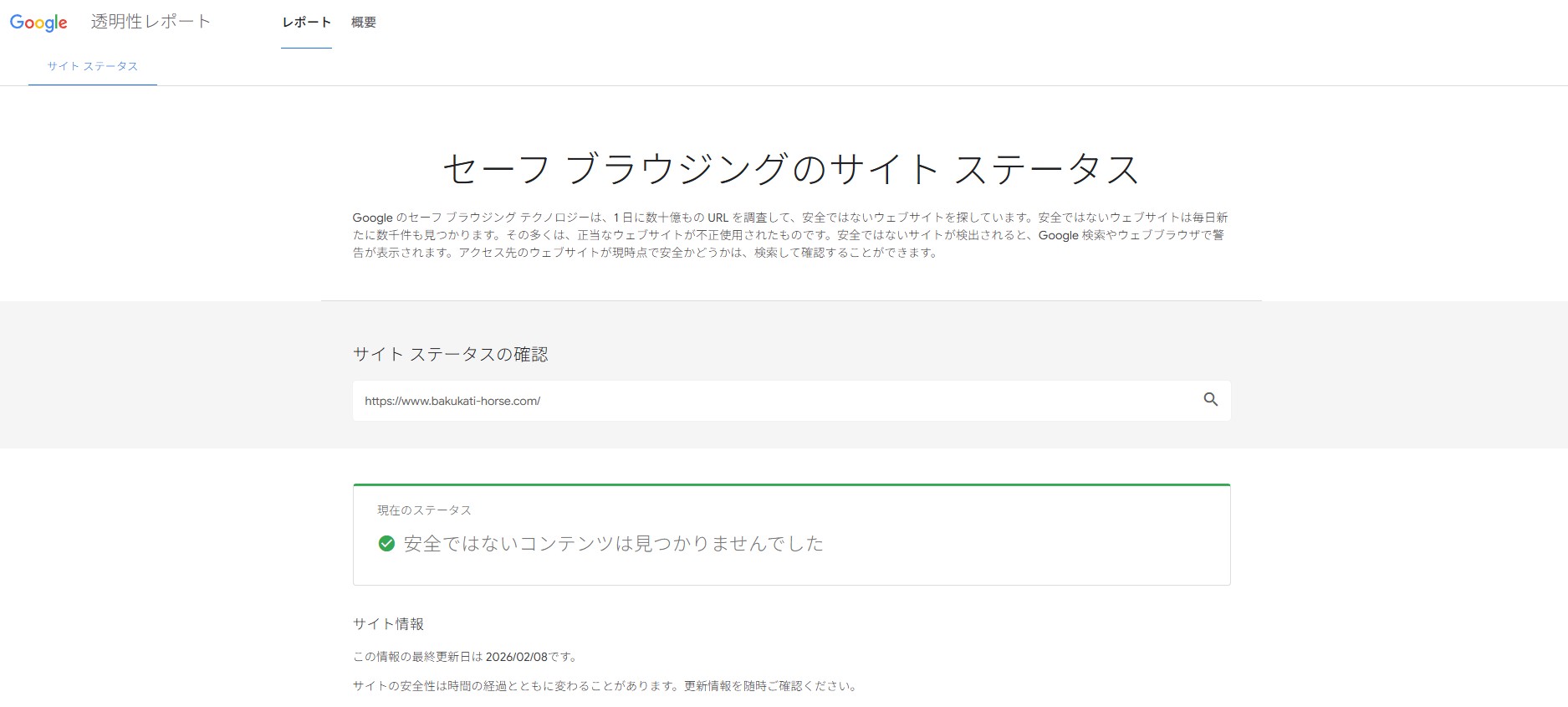 念のため、Googleのセーフブラウジングチェックでも確認しましたが、「危険なコンテンツは検出されていない」という結果でした。