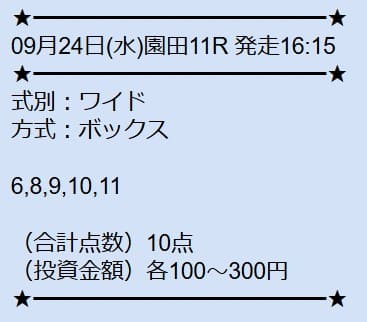 - 09/24 園田11R ワイド 12,200円的中