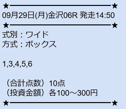 - 09/29 金沢6R ワイド 2,200円的中