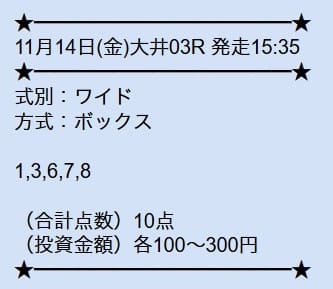 | 池上式指数術 | 150,000円 | 1,000,000円 | 三連単 | 5,000円 |