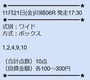 | 対象会場/レース名 | 川崎6R | 大井3R | 名古屋9R | 盛岡9R | 門別3R |