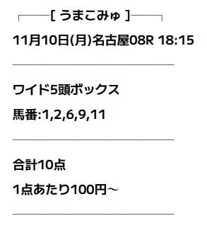 それがどれほど当たるのか、買い目の指示通り、ワイド5頭ボックスを1点1,000円ずつ購入し、合計10,000円分の馬券を買いました。