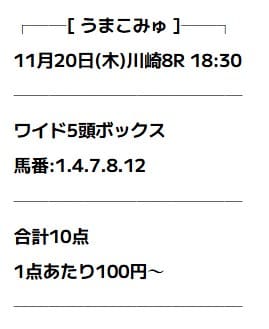 | 運命の交差点 | 320,000円 | 3,000,000円 | 三連単 | 1レース5,000円以内 |