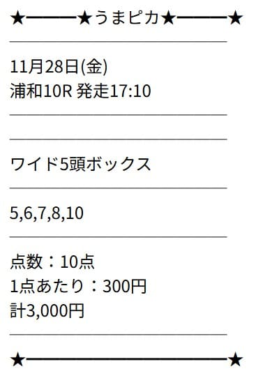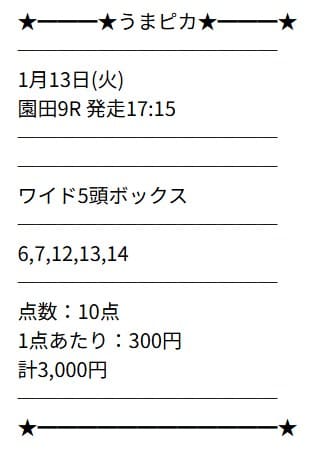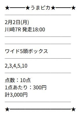 「僕も無料予想で1000円同じようにワイドで買ってみたら当たりました!まさかの3通り全部的中で7,000円以上に。しかも翌日、翌々日も同じく当たってます(笑)配当はそんなに高くないですが的中率が高いので少しずつ利益がでてます。」