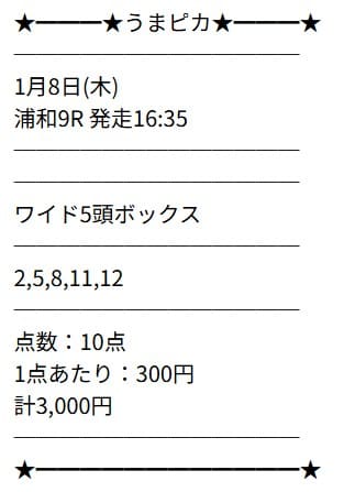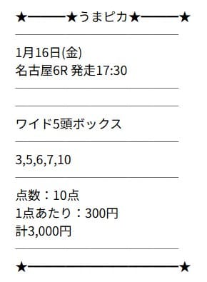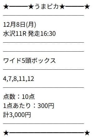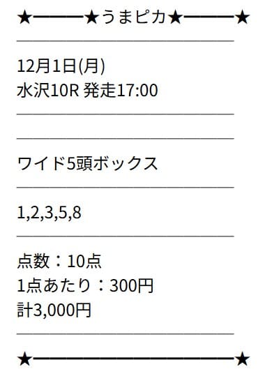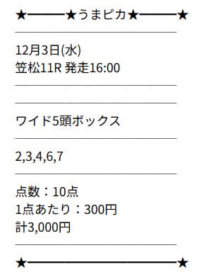| 券種 | 中央競馬:自由(推奨馬5頭を公開) 地方競馬:ワイド5頭ボックス |