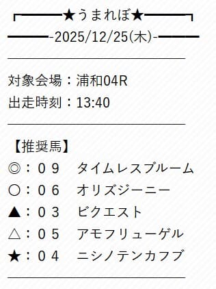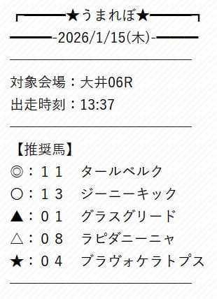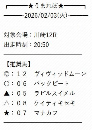 | 公開時間 | 地方競馬/無料予想:当日13時00分~
