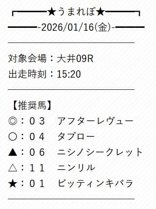 | サイト名 | うまれぼ | カチウマの定理 | スーパーマンバケン | えーあいNEO | 競馬2.0 | 競馬クイーン | みどりの的中らんど | 裏モノ競馬 | うま遊勝 | OMAKASE | 縁 | マンバケンプラス | キリフダ | 万馬券EXPO | うまこみゅ | カチケン | ウマドラ | 競馬タイム | 新しい競馬のカタチ | リスタート | スゴ腕 | 本命 | サラコレ | R32 | ディギン競馬 | うまピカ | 競馬リベンジャーズ | ニジュウマル | テキカク | バツグン | 天才!穴馬党 | 逆転の週末 | ツカメル | 最上式勝馬投票券 | 穴馬ch25 | ONE | アナログ | ラクショー | テッパン | うまスグ | 競馬ミニッツ | シンケイバ | 逆転競馬 | サラブレッド大学 | うまマル | 万馬券RUSH | えぶり | リホラボ! | BAXIS | ドンピシャ | 競馬サンシャイン | 的中サークル | ディバイン | 競馬サプライズ | 暁 | 大当たり競馬 | ウマークス | ウマニティ | ハーレム競馬 | 競馬センス | スター競馬 | ケイバ一番星 | ウマ1グランプリ | プラチナム | 勝ち馬の定石 | 高配当21 | 栗東会議 | レープロ | 競馬グラント | シン競馬スピリッツ | 穴馬ch25 | 社長競馬 | ベストホース | オールウィン | あぶの競馬予想 | 深く考えない競馬 |
