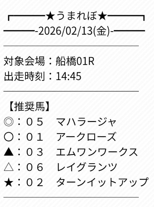 - 01/21 船橋1R ワイド 5,400円的中