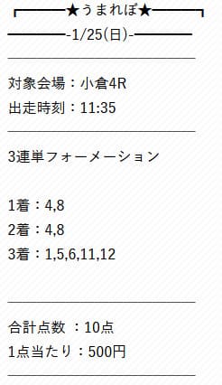 - 01/25 小倉4R 三連単 508,500円的中