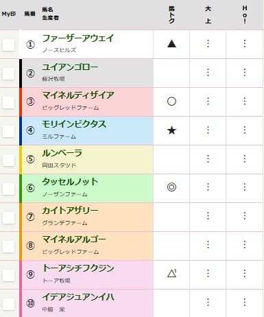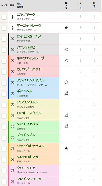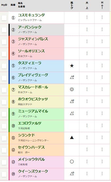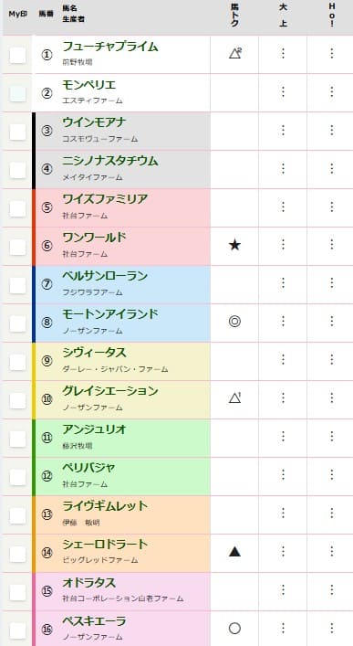 | 印 | 馬番 | 馬名 | 人気 | 単勝オッズ |