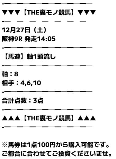 裏モノ競馬の買い目はシンプルで見た瞬間に理解できるという声が多いです。
