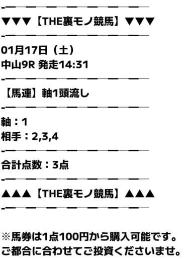 - 01/17 中山9R 馬連 13,700円的中